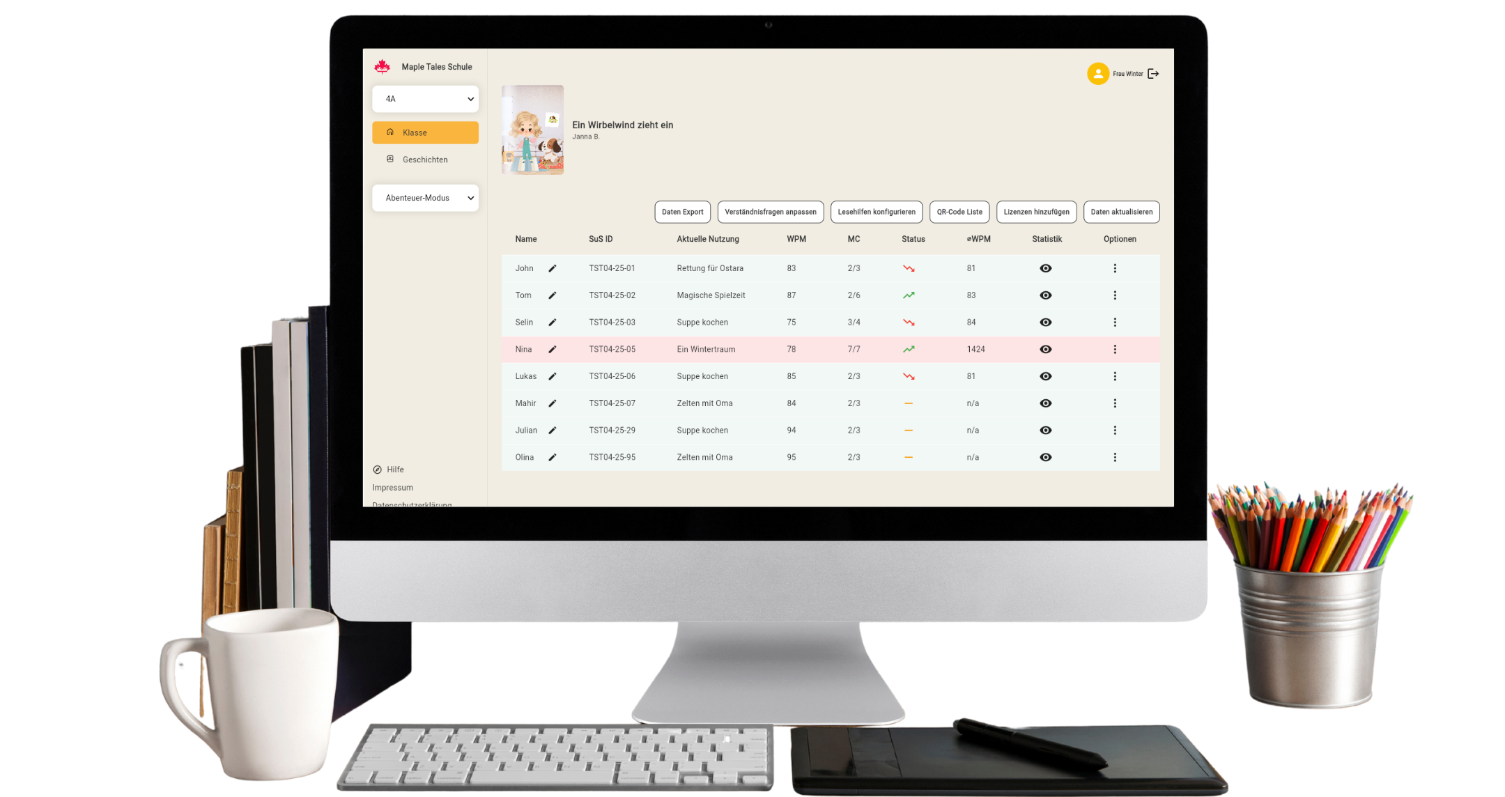 Die Maple Tales Schulversion besteht aus der Web-App von Maple Tales, welche die Lesedaten und -Feedback der Kinder anzeigt und der Maple Tales App, welche die Kinder in der Klasse nutzen.